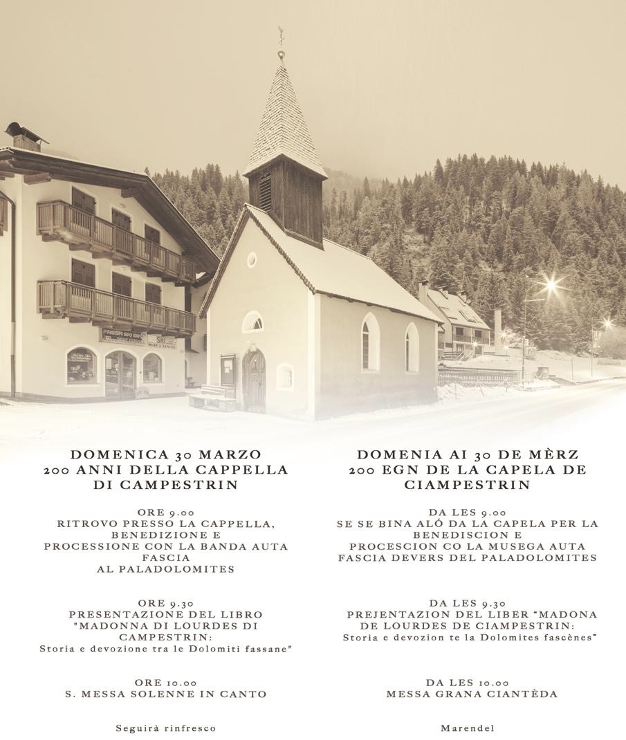 Per festeggiare i 200 anni della Chiesa Madonna di Lourdes di Campestrin, domenica 30 Marzo alle ore 9.00 si terrà la benedizione della Cappella, seguirà la processione della Banda Auta Fascia fino al teatro PalaDolomites, dove alle 9.30 si terrà la presentazione del libro "Madonna di Lourdes di Campestrin: Storia e devozione tra le Dolomiti fassane".